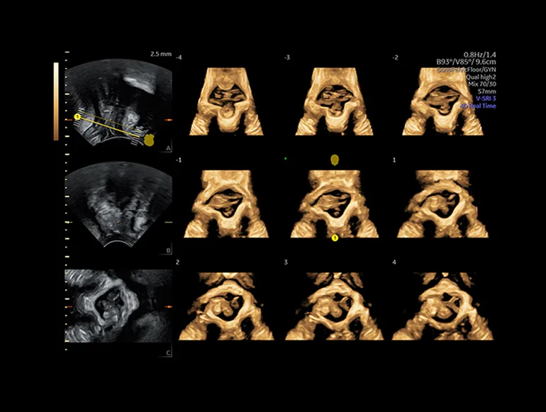 Тазовое дно (серия плоскостей), визуализированное с помощью функции SonoPelvicFloor на основе ИИ